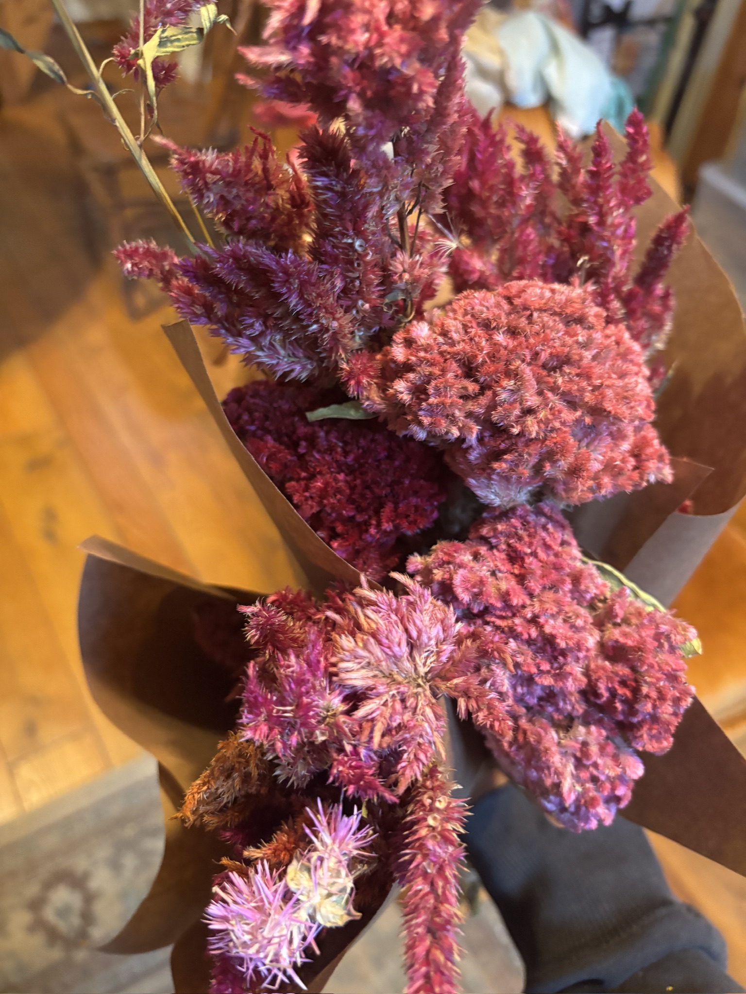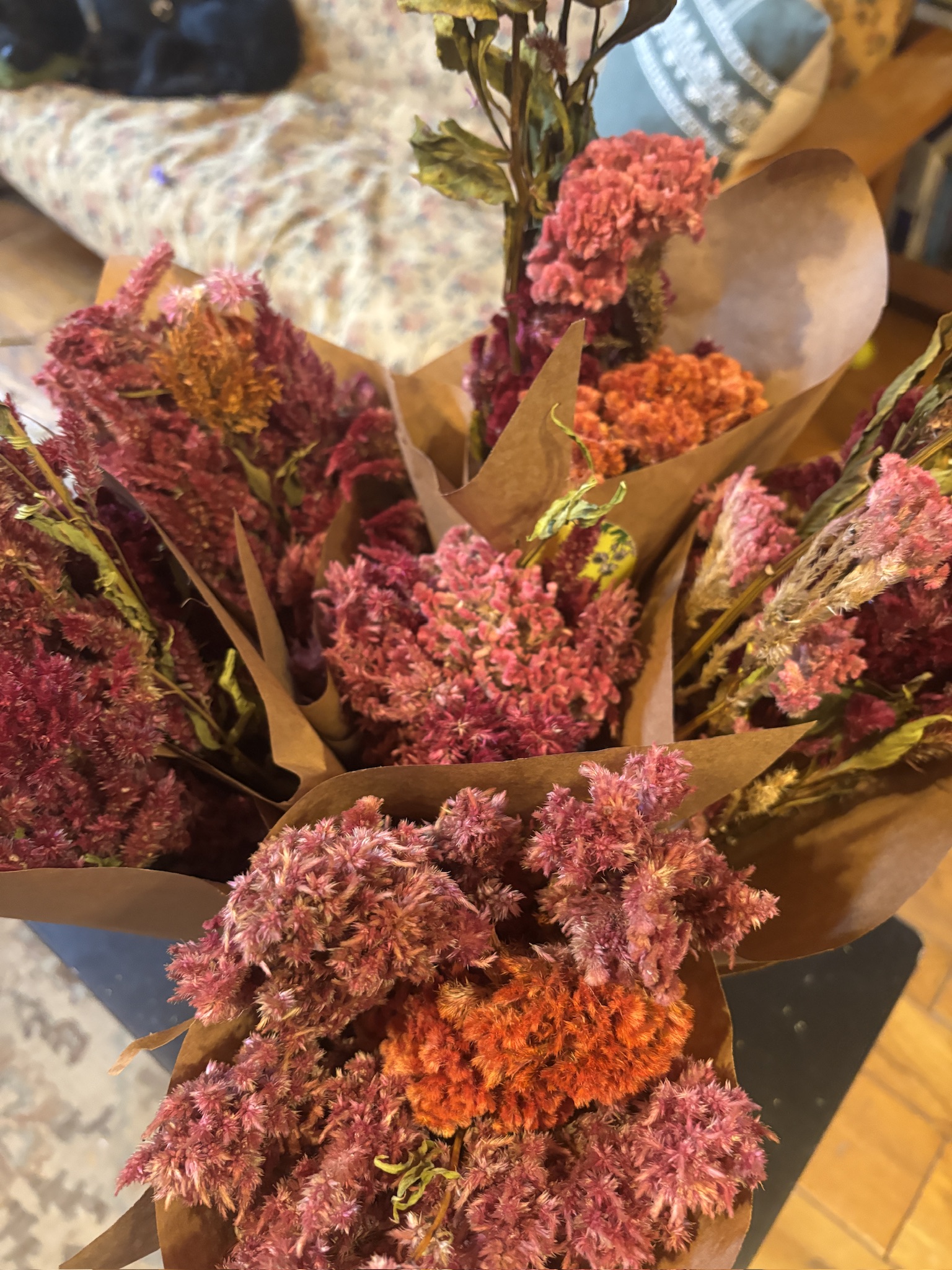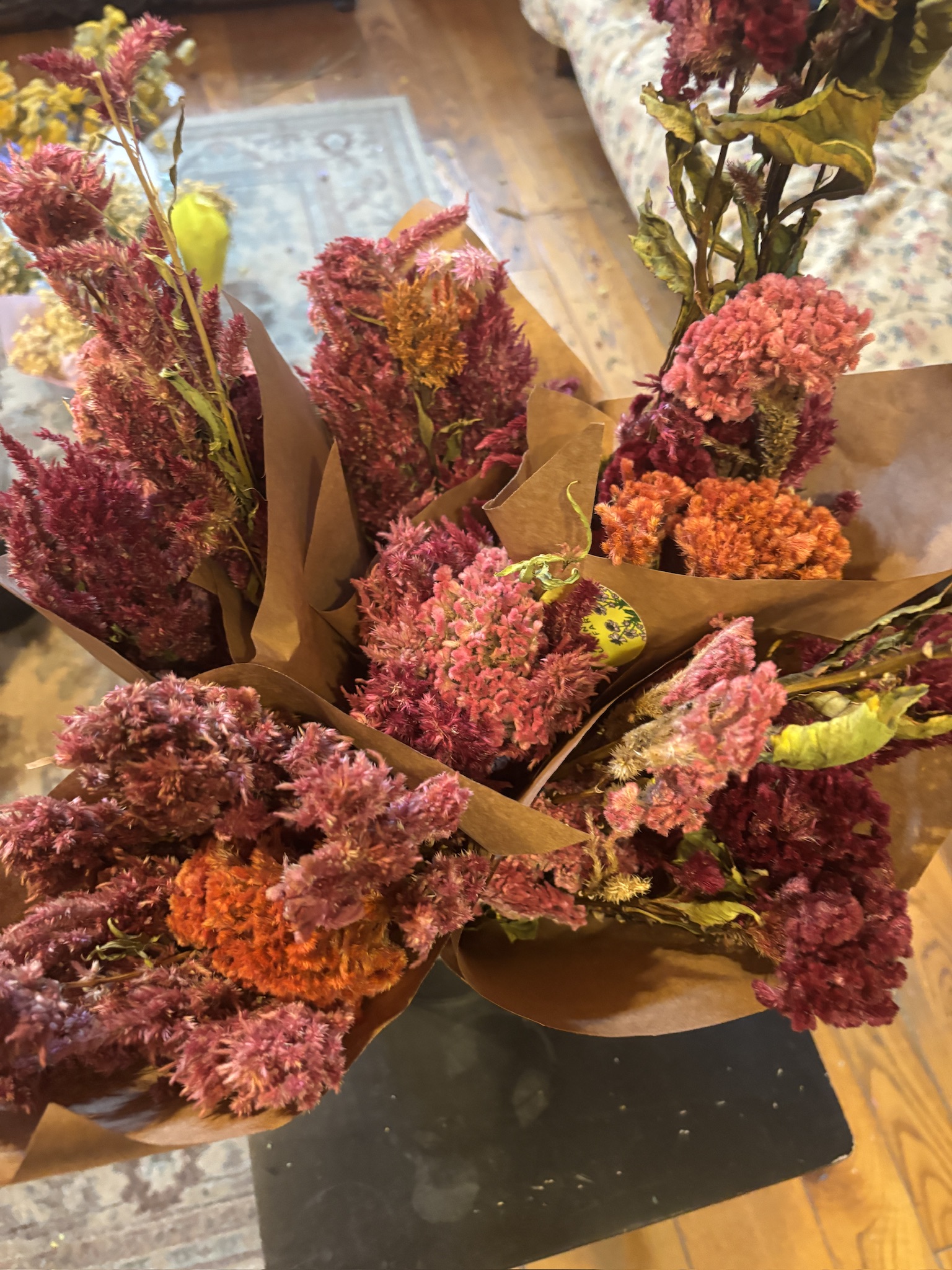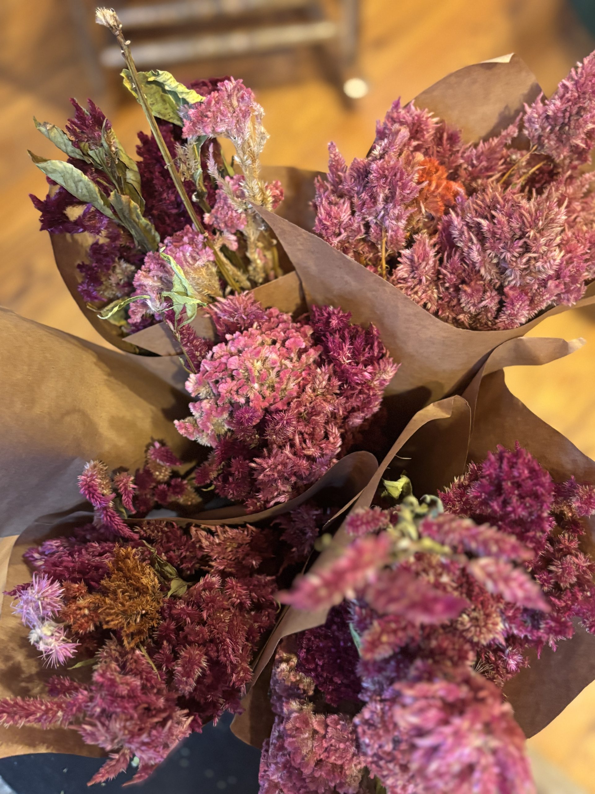 Brightly colored cockscomb and spike celosia. Color range from bright pink to light pink to coral. Specify any color preferences in order notes. Long strong stems. 10-20 stems/bunch.