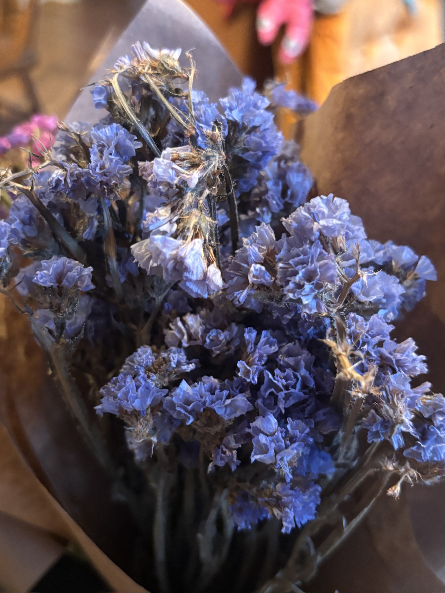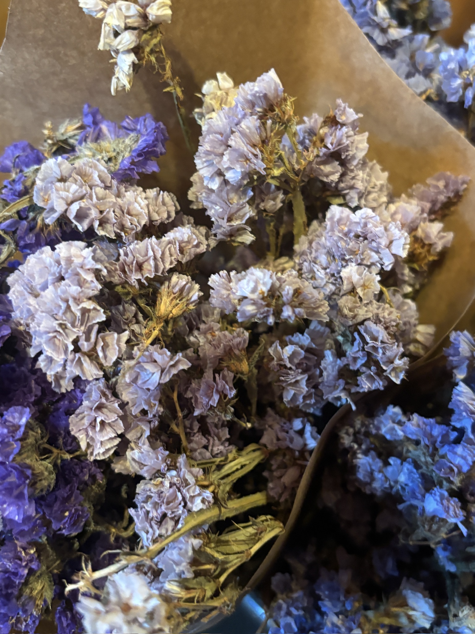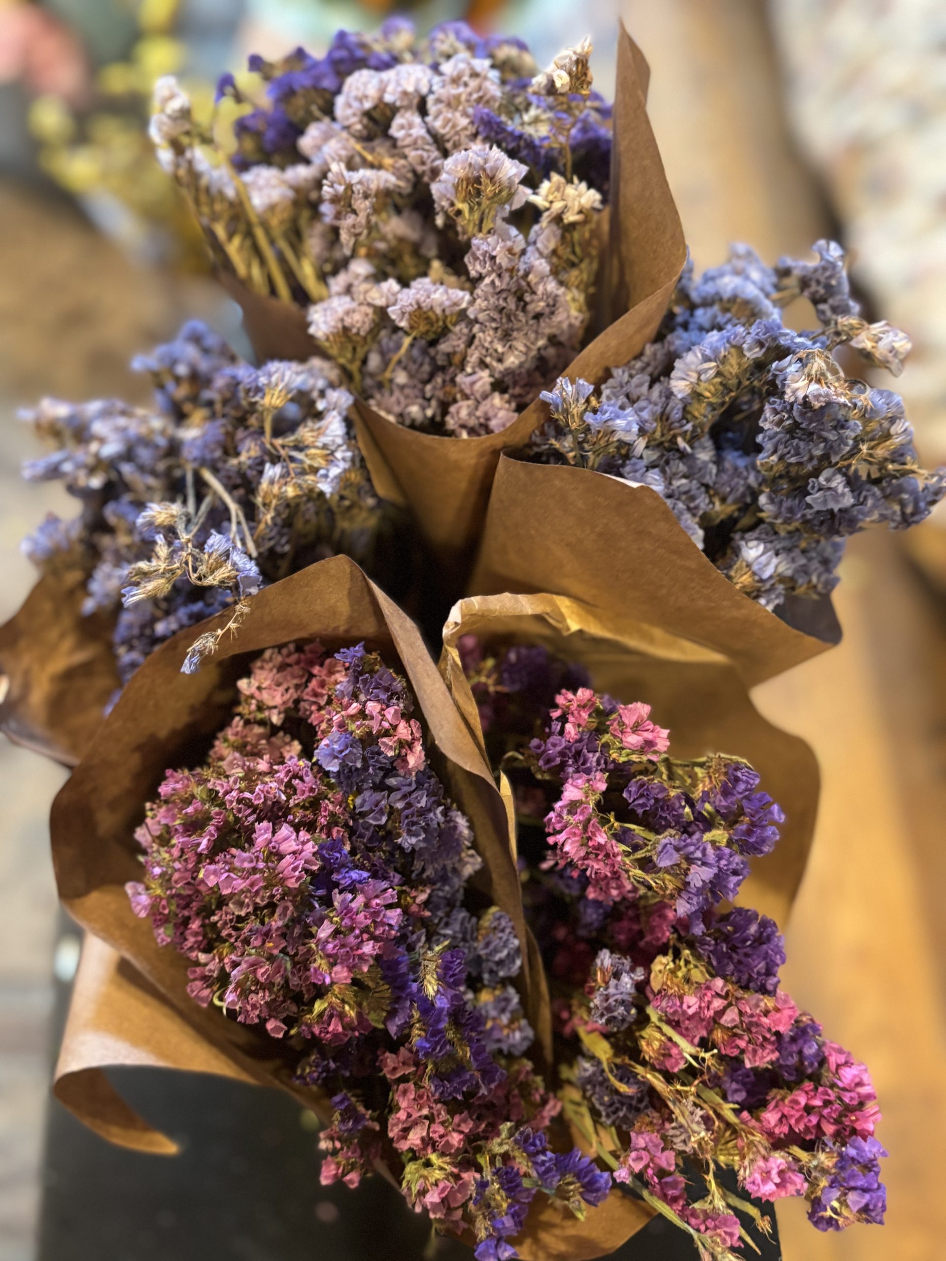 Brightly colored everlasting statice and long strong stems. Each bunch is one color or shade, tell us your color preference in the order notes- yellow, dark purple, blue, light purple and pink.