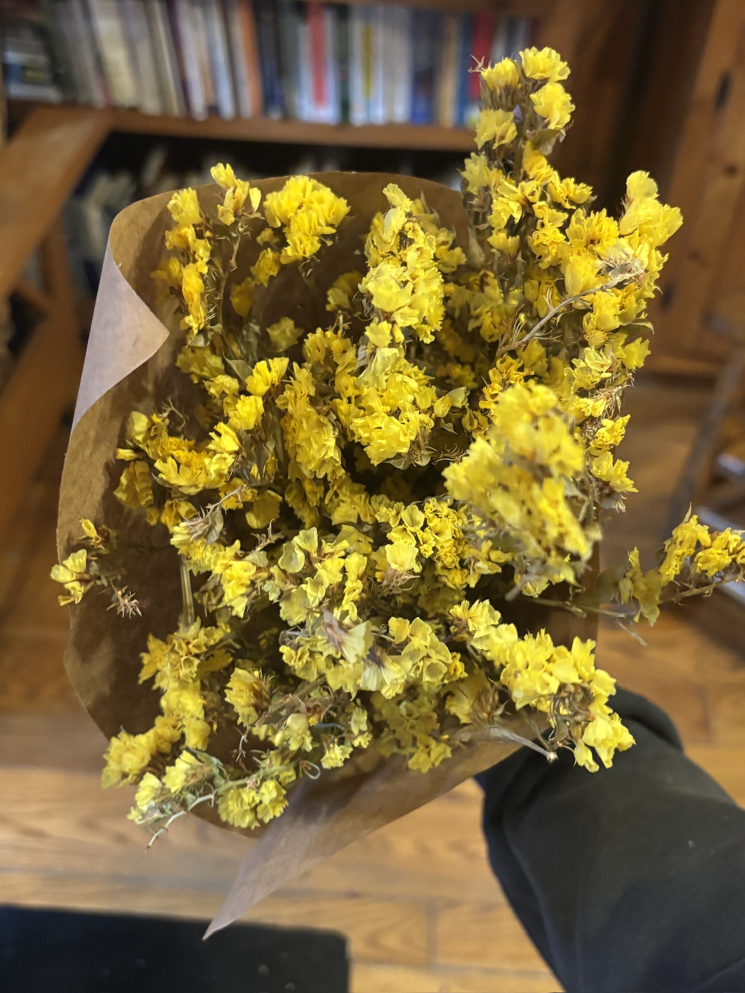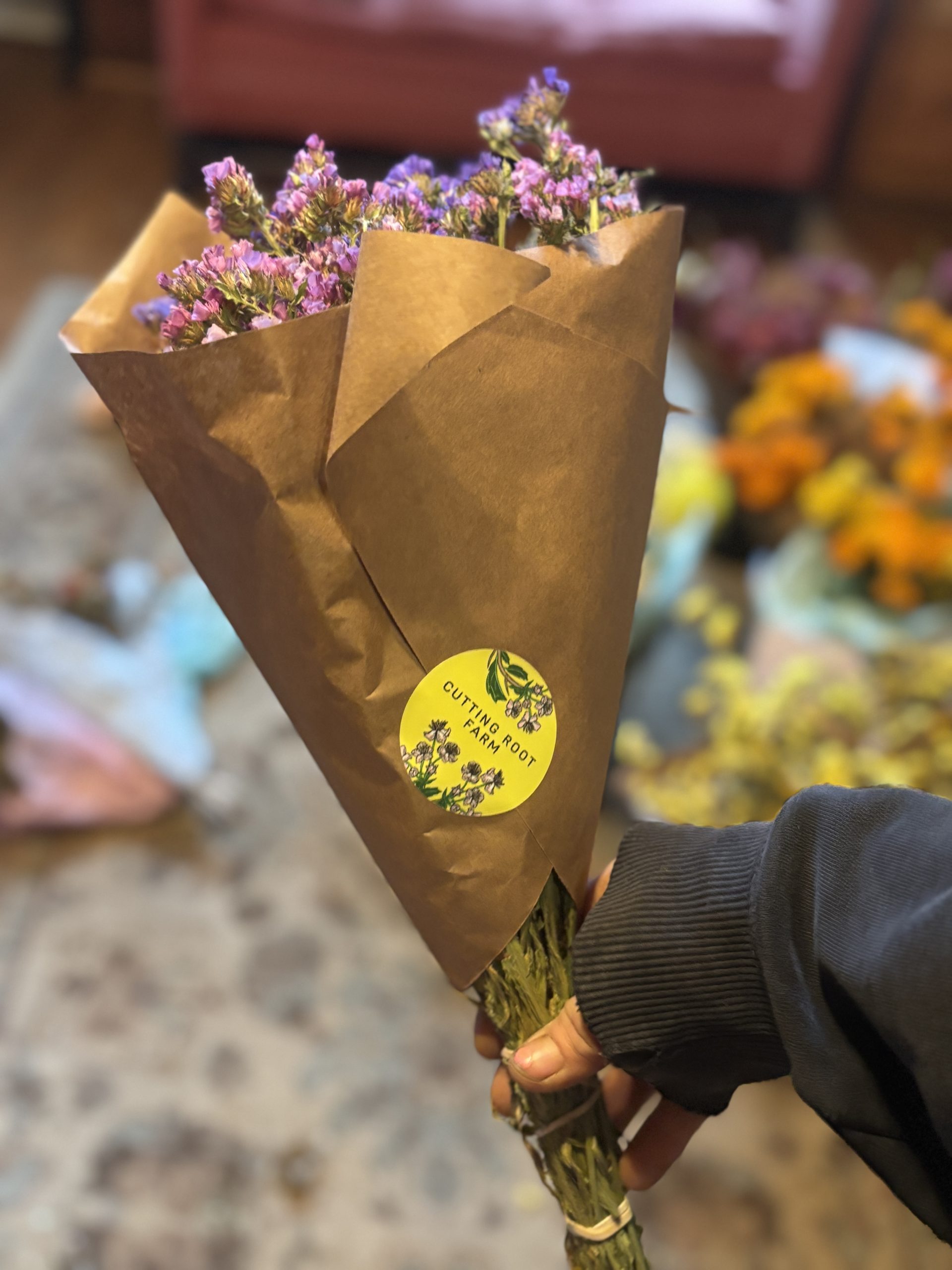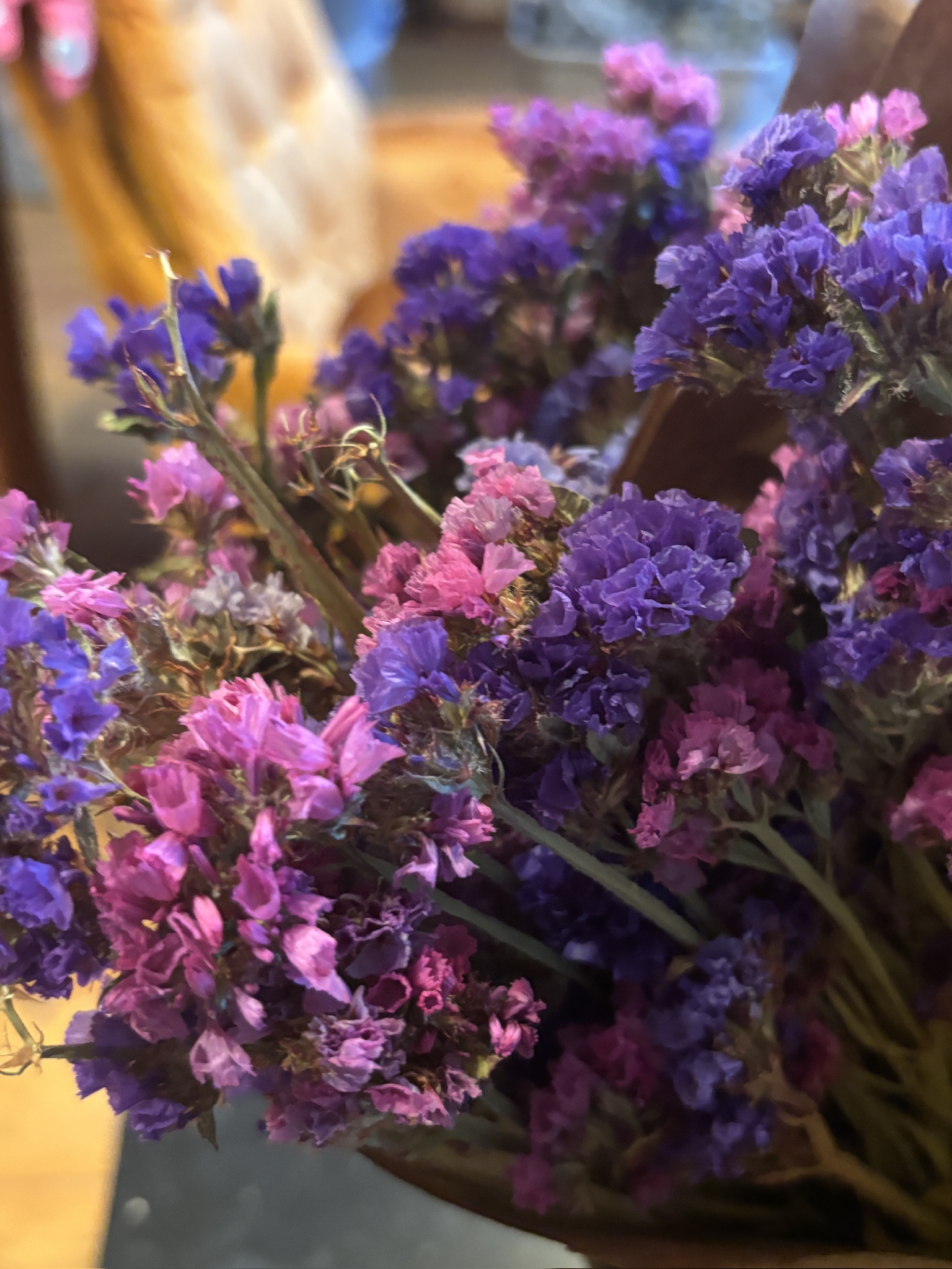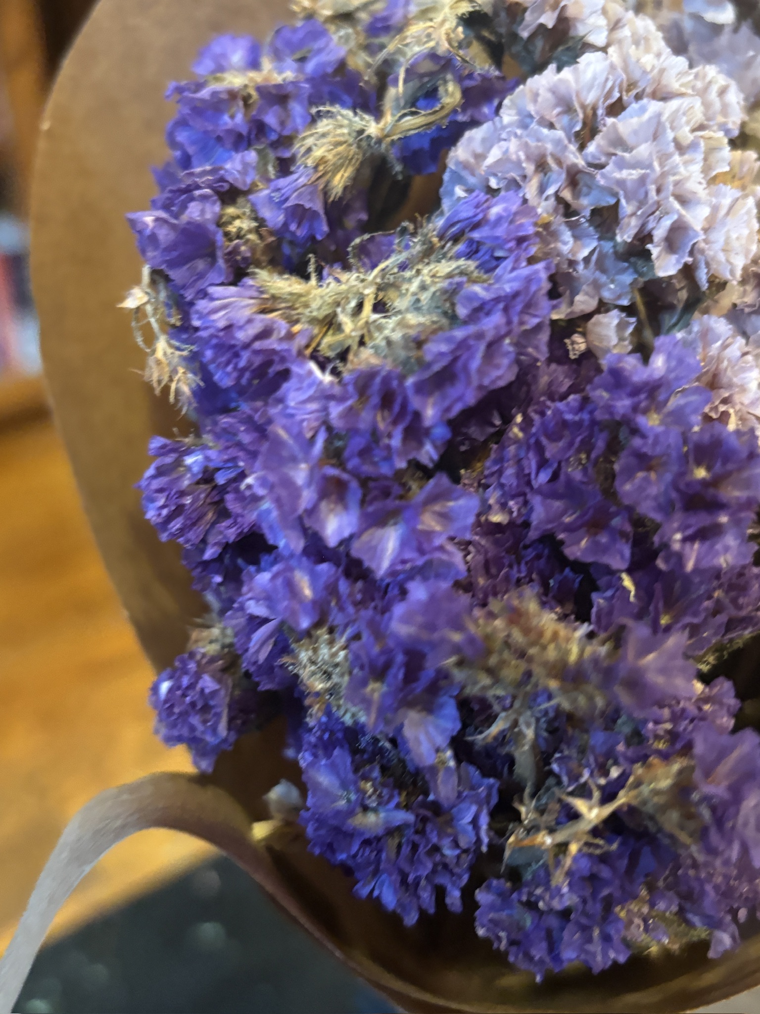 Brightly colored everlasting statice and long strong stems. Each bunch is one color or shade, tell us your color preference in the order notes- yellow, dark purple, blue, light purple and pink.